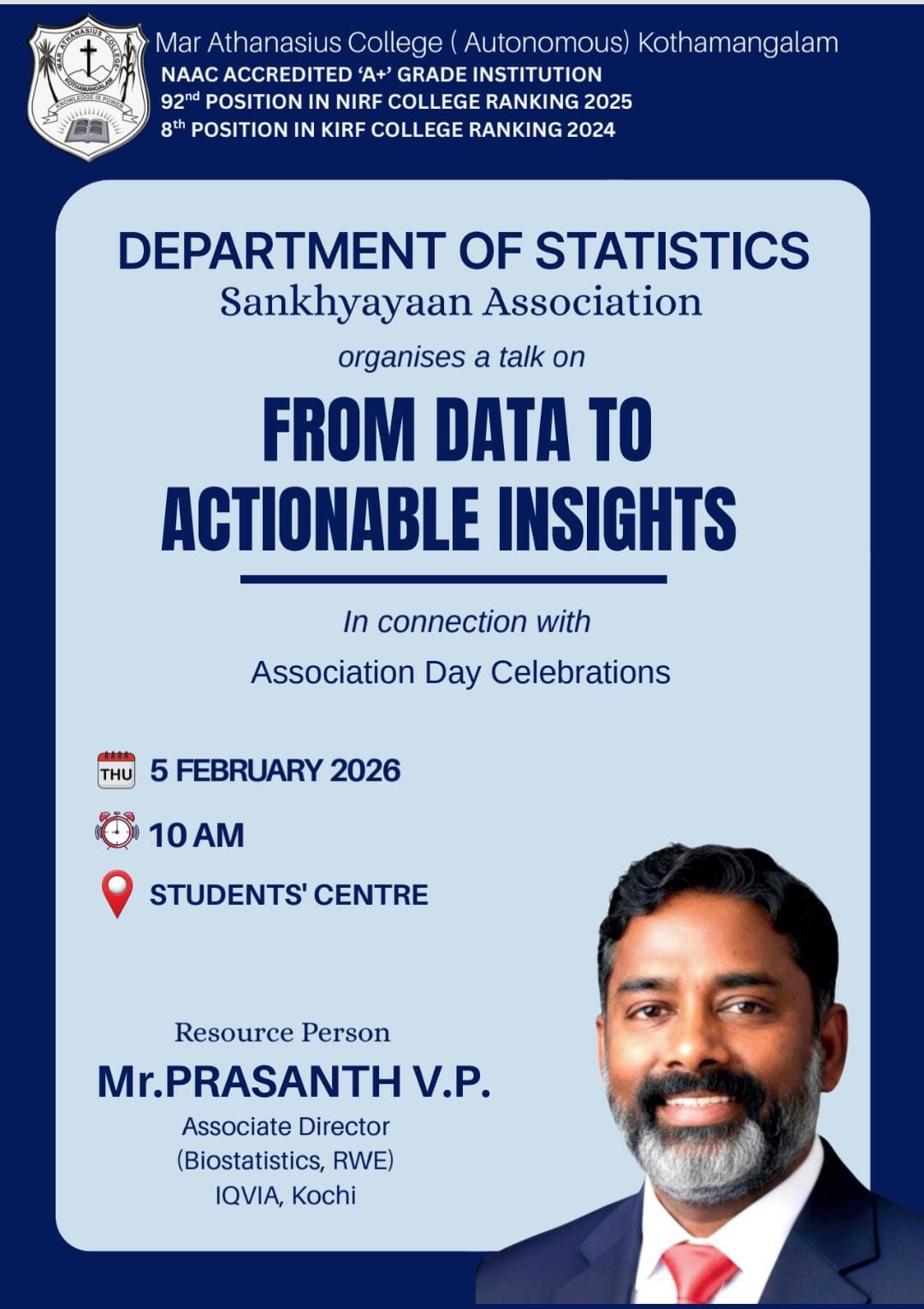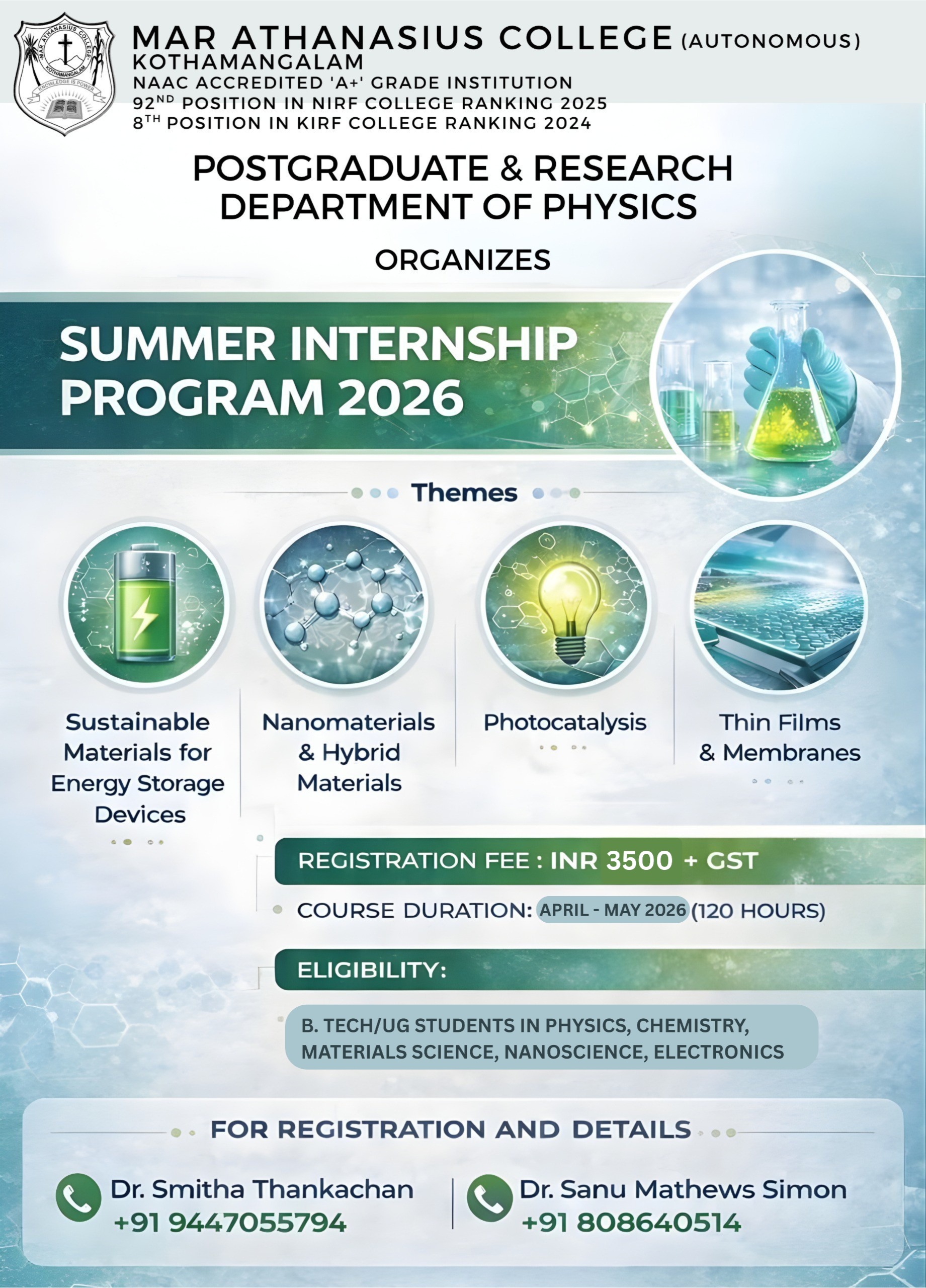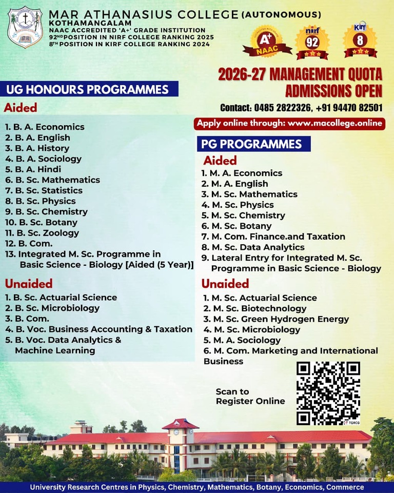 Mar Athanasius College, a premier institution of higher education in Kerala, was founded in 1955 at Kothamangalam. The college was guided and its character shaped by a group of visionaries led by its first Association Secretary and Principal Prof. M.P Varghese.