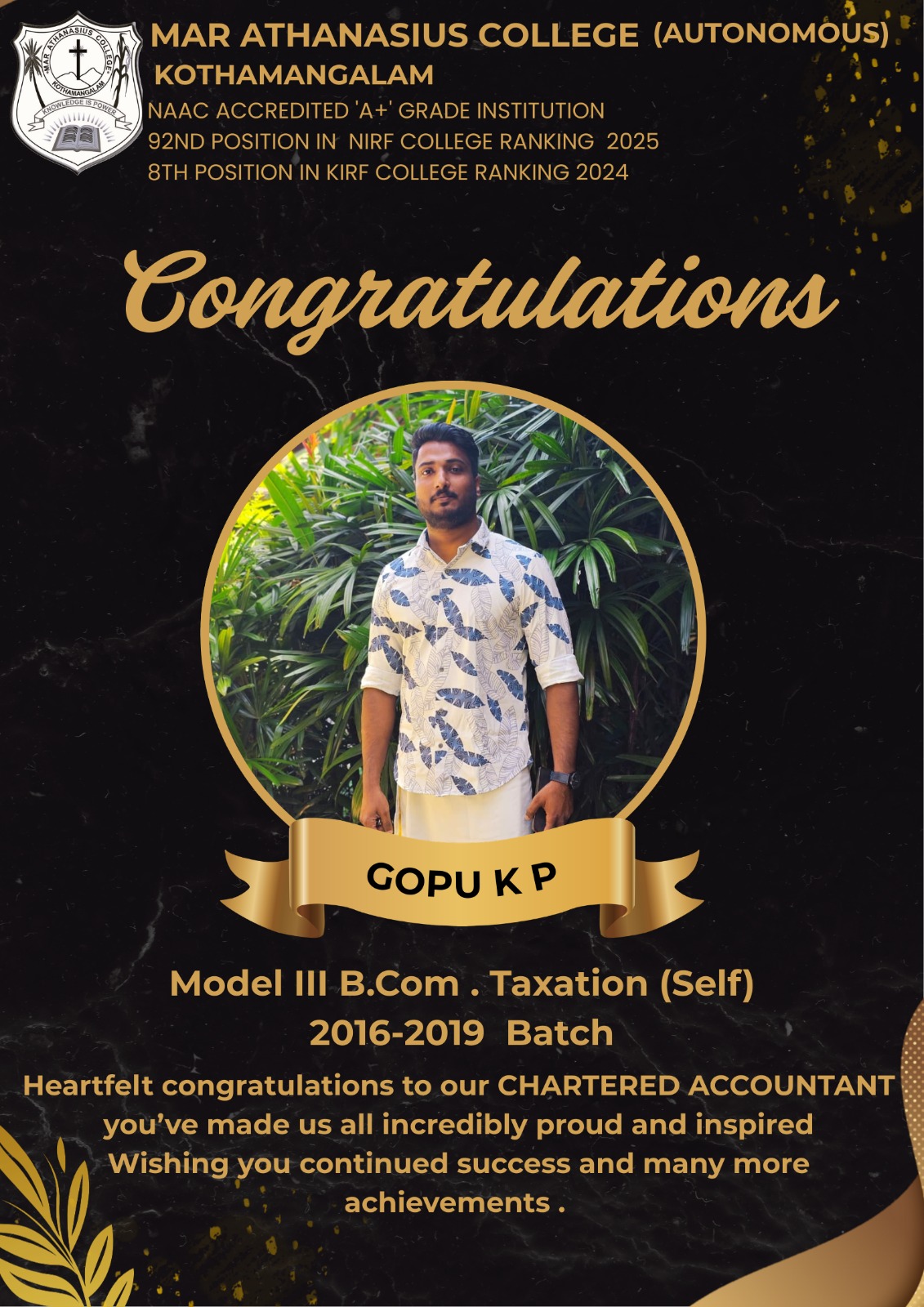 Gopu K P , B.COM. Model III Taxation Student (2016-2019) Batch Qualified Chartered Accountant.
