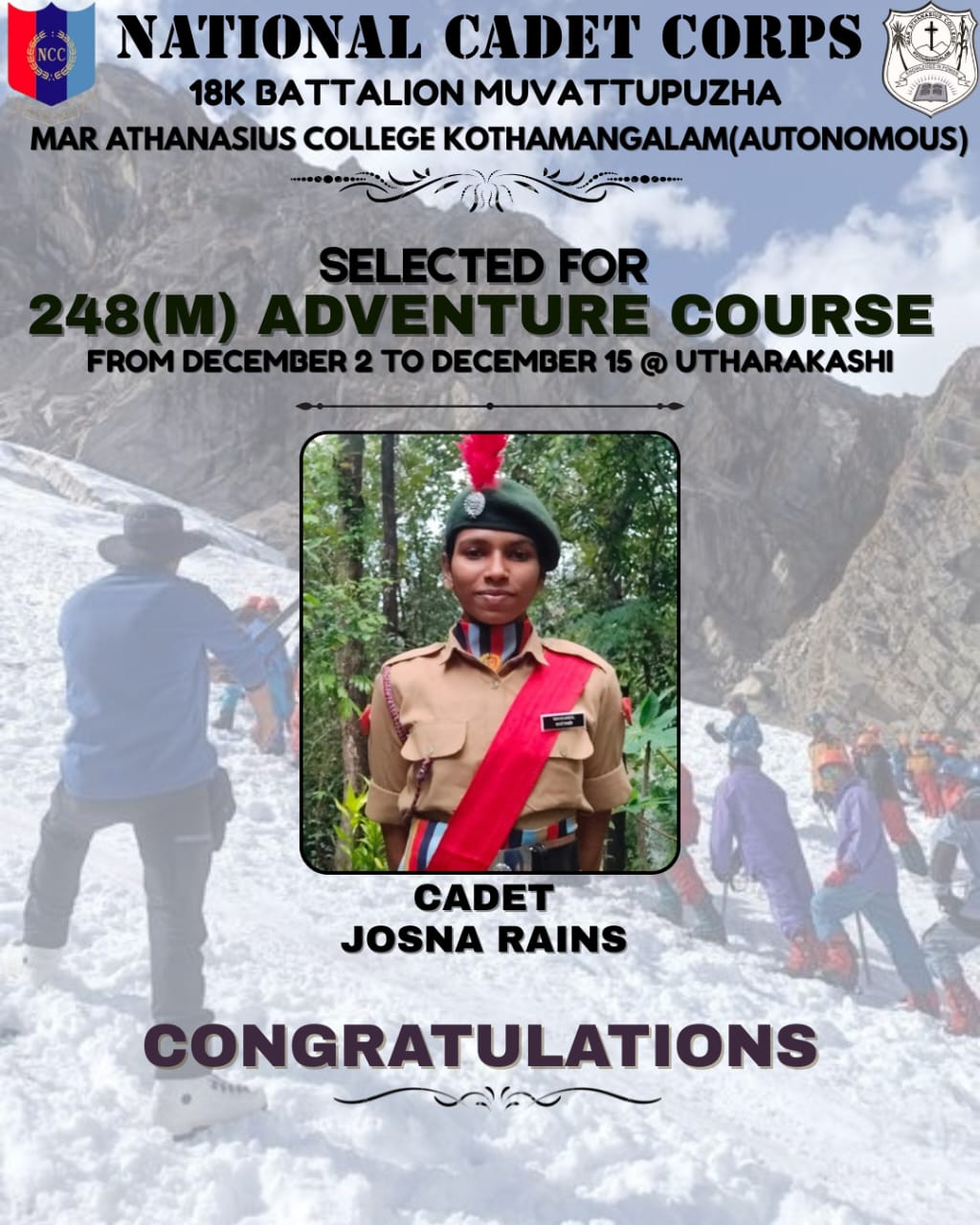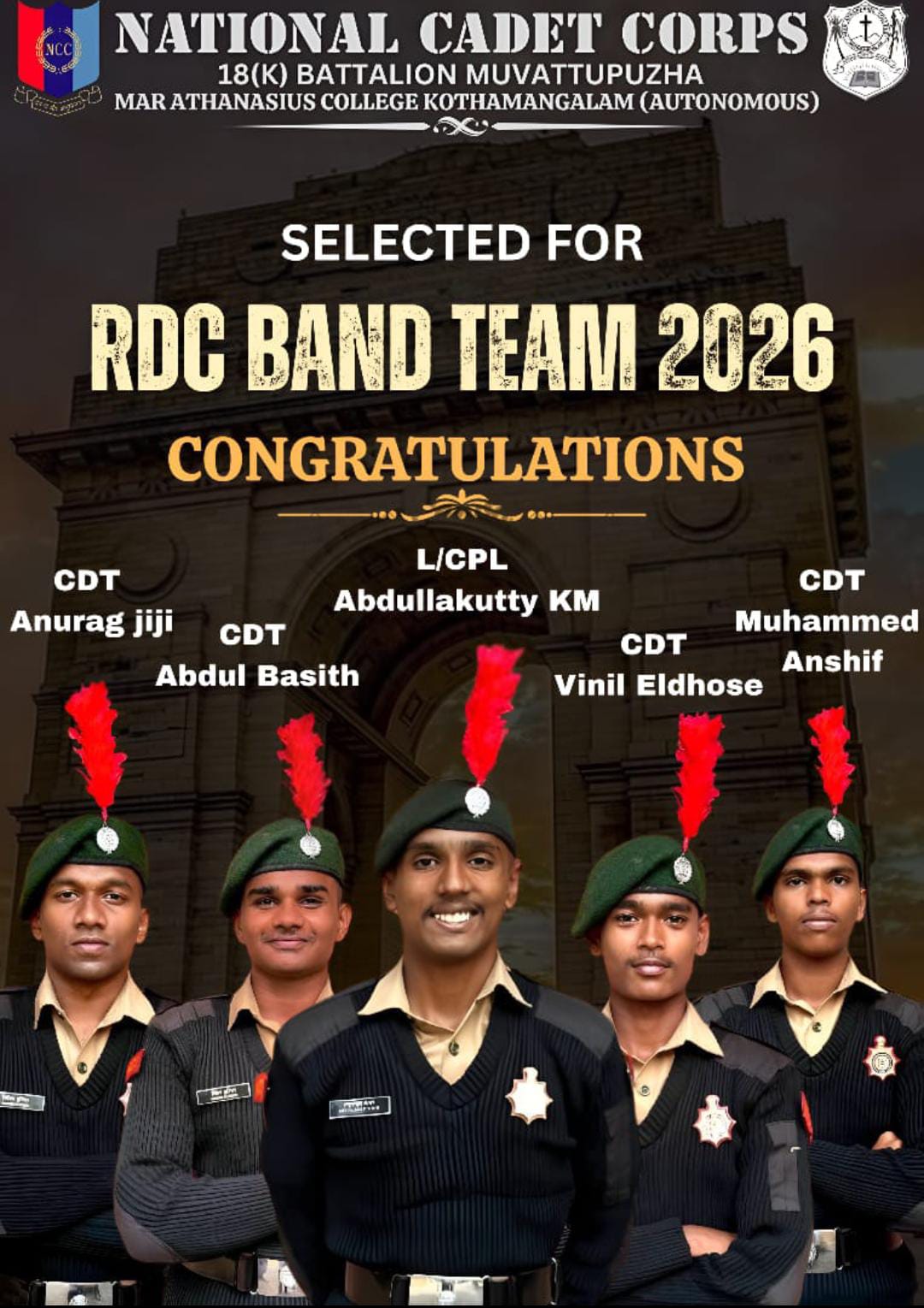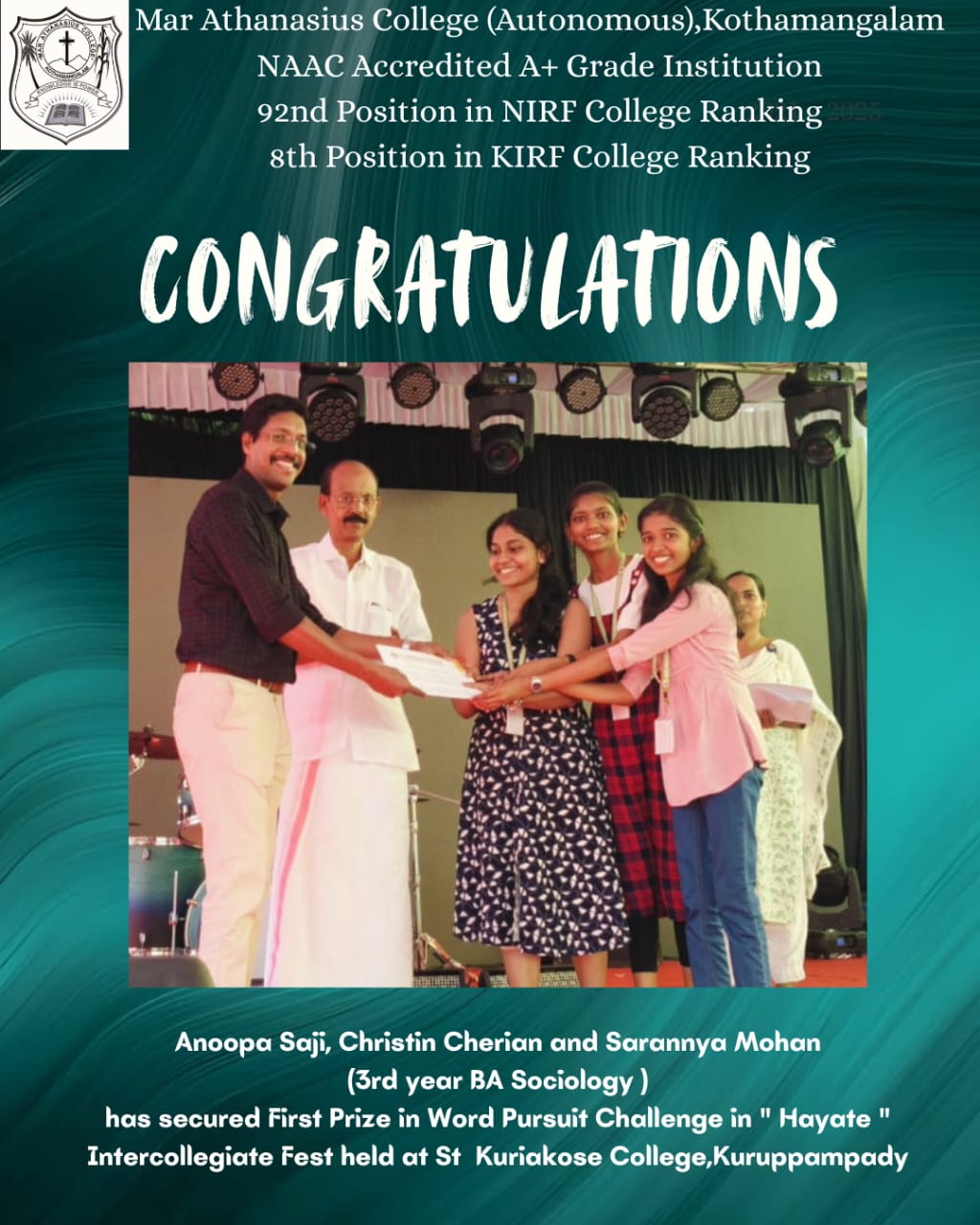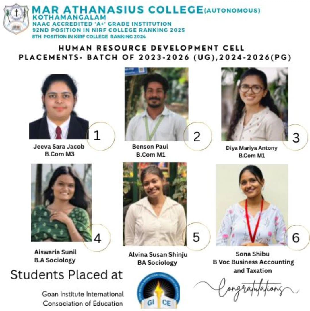 Mathukutty Sibichan, 2021-24 batch B.A. Sociology student, secured third in Kerala state Inter Club 10 km Walking, second in Kerala state Cross Country 8 km Walking, first in University Cross Country 10 km Waking, and participated in Senior Athletic Championship 20 km Walking.