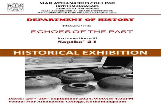 The department of History in M. A College, established in 1979, presently offers a B. A programme in History. During an academic year, it caters to the academic needs of 40 students (sanctioned strength) specializing in History, 40 more students through complementary (subsidiary) courses and another 25 students through open courses. Presently there are 3 permanent teaching staff and a guest faculty in the department. Faculty have published in excess of 15 research papers as well as took part in several projects over the last few years.