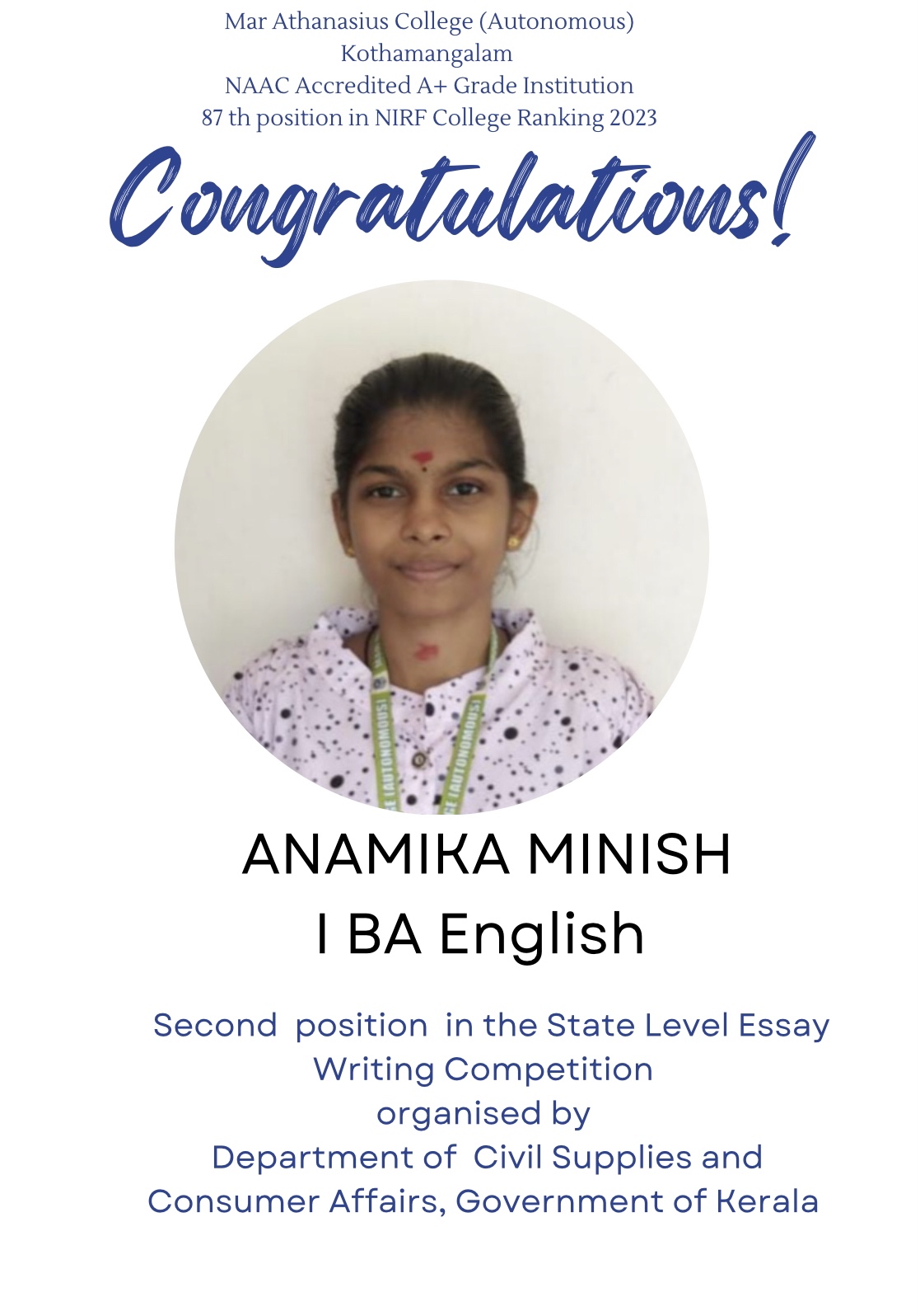 Anamika Minish of I BA English won Second prize inthe State level Essay competition organised by Department of Civil supplies and Consumer Affairs, Government of Kerala.