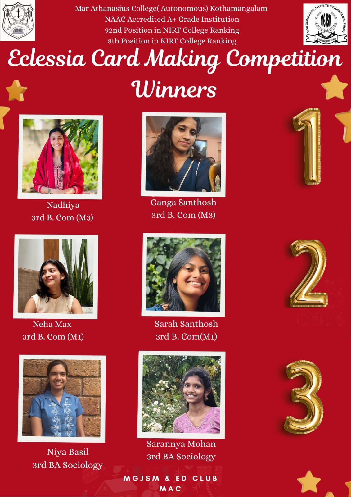 Betty Benny, 2020-23 batch B.A. Sociology student, bagged gold, silver, and bronze medals for Heptathlon at the national and state level, and grabbed bronze medal for MG University Weightlifting Championship.