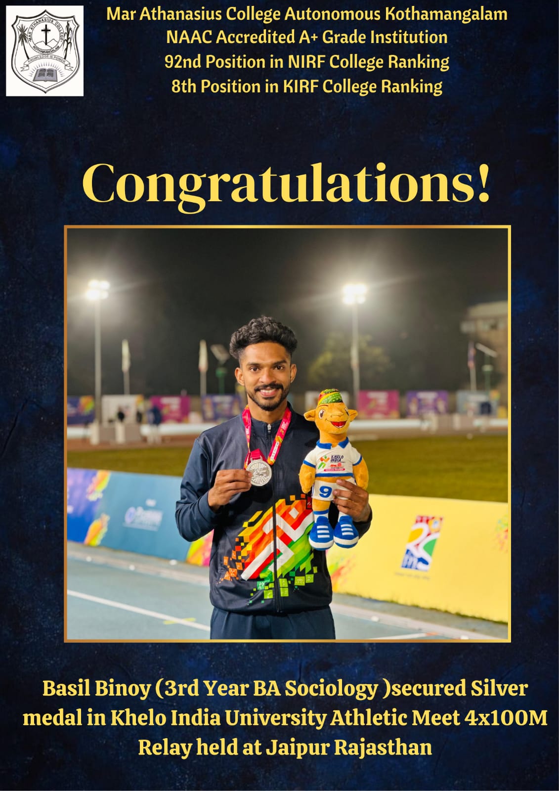 Alen John, 2021-24 batch B.A. Sociology student, bagged gold and silver medals for 4x400m Relay at the state level.