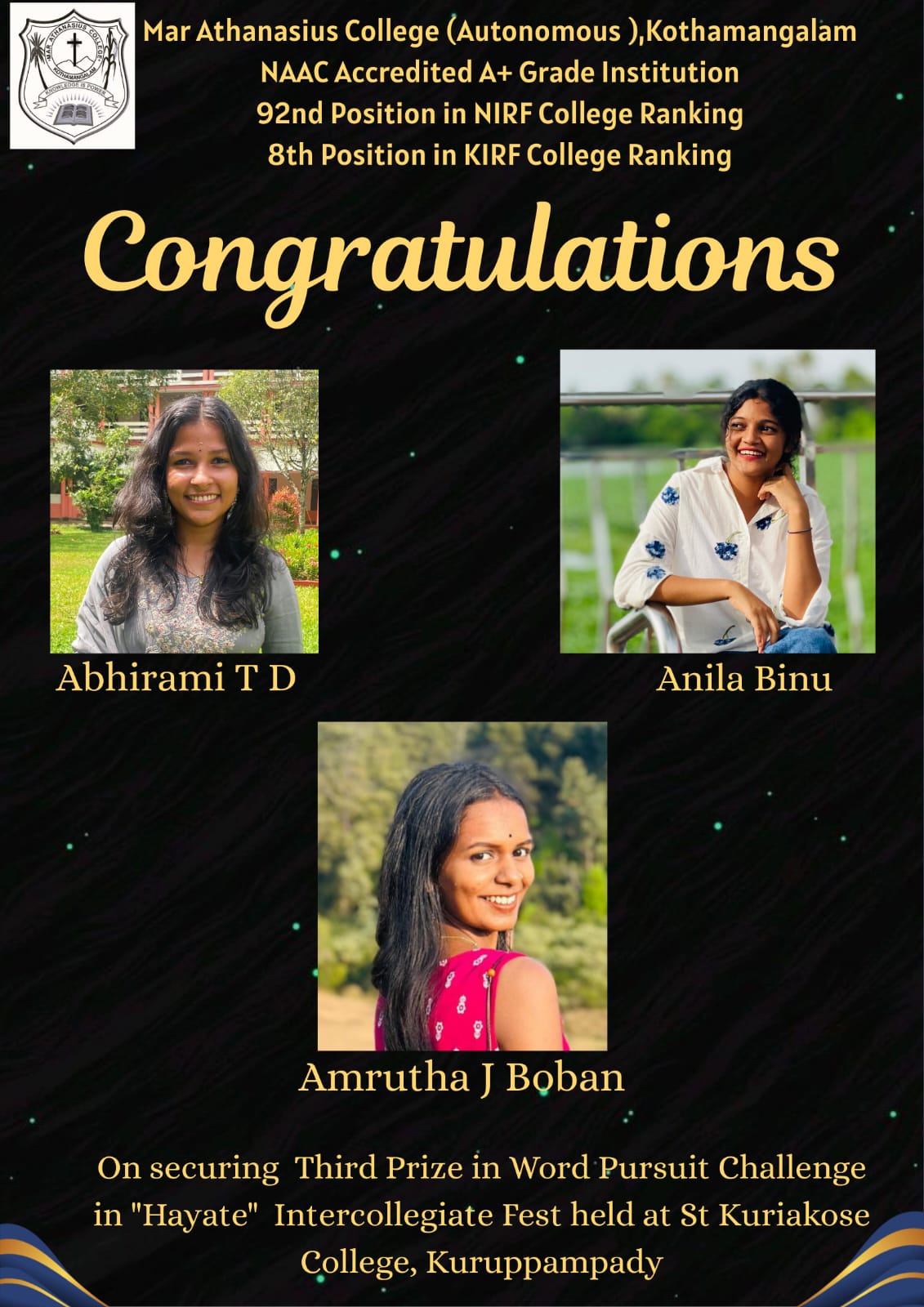 Mathukutty Sibichan, 2021-24 batch B.A. Sociology student, secured third in Kerala state Inter Club 10 km Walking, second in Kerala state Cross Country 8 km Walking, first in University Cross Country 10 km Waking, and participated in Senior Athletic Championship 20 km Walking.